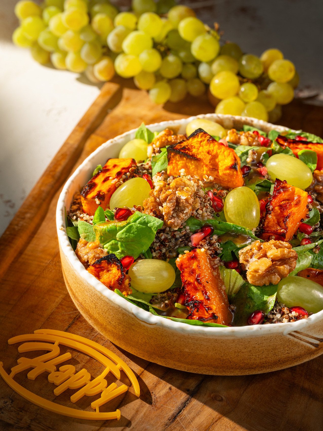 До нея се нарежда златният карфиол – хрупкав и неустоимо лек, превърнат в малък шедьовър. А салатата „Златна есен“ с грозде и печена тиква добавя свежест и цвят, напомняйки, че есента може да бъде и лека, и изненадваща.